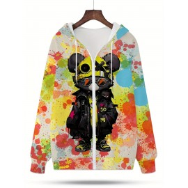 メンズ カラフル3Dトイベアプリント ジップアップフーディー - カジュアルポリエステルニット、ペイントスプラッターデザイン、洗濯機可 春/秋用、7色