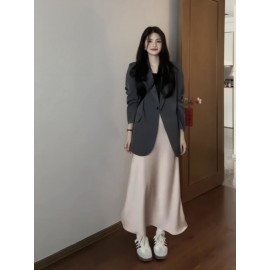 女性用軽量春/秋スモールブレザーベスト - シックなカジュアルルーズフィット長袖無地ボタンフロントHシルエットジャケット、多様なレイヤリングに適した季節のファッション|高品質生地
