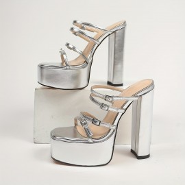 厚底女性用チャンキーヒールシルバーカラー夏新作高品質プラットフォームクロス細ストラップオープンバックスンダル