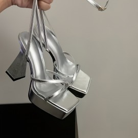 女性用サマーハイヒールサンダル - 15cmのスティレット、スクエアトゥ、アンクルストラップ付きのバックルクロージャー、メタリックフィニッシュ、大きなプラットフォーム、ブラック&ホワイトのモダンなデザイン|スクエアトゥデザイン|ゴムソール